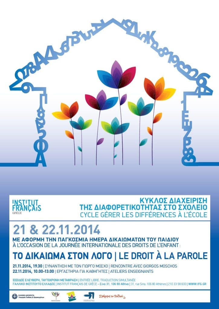 Με αφορμή την παγκόσμια Ημέρα για τα Δικαιώματα του Παιδιού και τα 25 χρόνια της Διεθνούς Σύμβασης για τα Δικαιώματα του Παιδιού, το Γαλλικό Ινστιτούτο Ελλάδος διοργανώνει σε συνεργασία με τη Διεύθυνση Δευτεροβάθμιας Εκπαίδευσης Ανατολικής Αττικής και τον Συμβουλευτικό Σταθμό Νέων της, υπό την αιγίδα του Υπουργείου Παιδείας και Θρησκευμάτων, ανοιχτή συζήτηση με τον Γιώργο Μόσχο, Βοηθό Συνήγορο του Πολίτη για τα Δικαιώματα του Παιδιού.