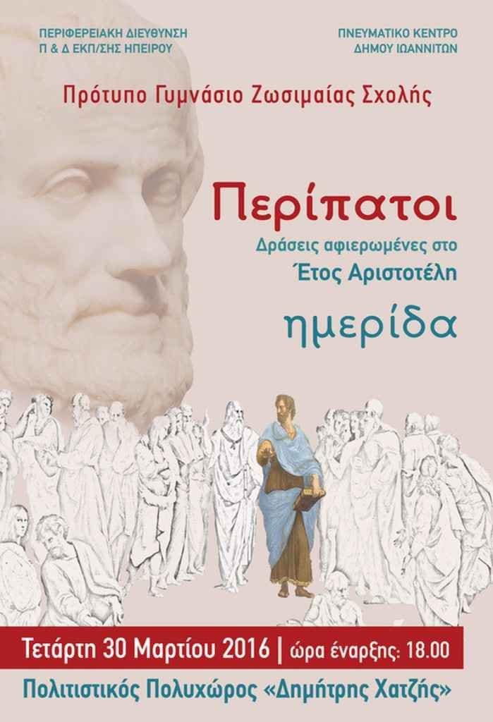 υπό την αιγίδα της Περιφερειακής Διεύθυνσης Ηπείρου και του Πνευματικού Κέντρου Δήμου Ιωαννιτών, σας προσκαλεί στη διάλεξη του Β. Κάλφα, Καθηγητή Φιλοσοφίας, Α.Π.Θ. με θέμα : “Ο Αριστοτελικός φυσικός κόσμος”, που θα πραγματοποιηθεί την Παρασκευή 14 Οκτωβρίου 2016 και ώρα 19:00 στον πολυχώρο “Δημήτρης Χατζής”, στα Παλιά Σφαγεία.