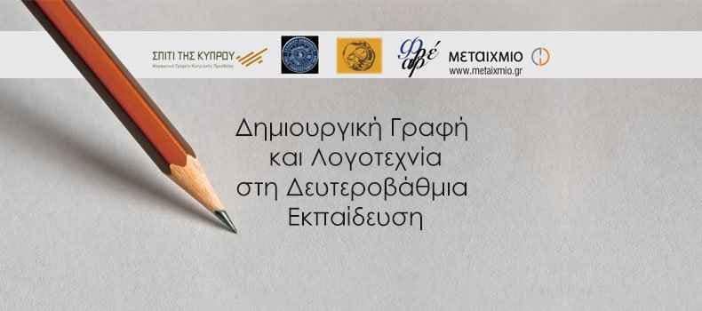 Tο «Σπίτι της Κύπρου», το Μεταπτυχιακό Πρόγραμμα «Ιστορική Έρευνα, Διδακτική και Νέες Τεχνολογίες» του Ιονίου Πανεπιστημίου, το επιστημονικό περιοδικό Νέα Παιδεία, το λογοτεχνικό περιοδικό ΦΡΕΑΡ και οι εκδόσεις ΜΕΤΑΙΧΜΙΟ σας προσκαλούν στην ημερίδα με θέμα «Δημιουργική Γραφή και Λογοτεχνία στη Δευτεροβάθμια Εκπαίδευση» η οποία θα πραγματοποιηθεί την Πέμπτη, 20 Οκτωβρίου 2016, ώρες 18:30-20:30, στο Σπίτι της Κύπρου (Ξενοφώντος 2Α, Αθήνα).