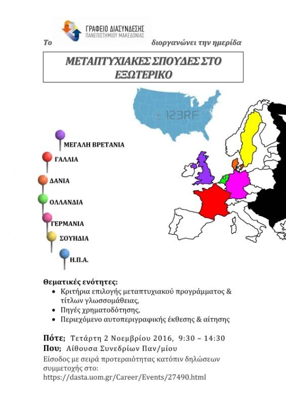 Το Γραφείο Διασύνδεσης διοργανώνει ενημερωτική εκδήλωση με τίτλο “Μεταπτυχιακές Σπουδές στο Εξωτερικό”. Θα παρουσιαστούν ζητήματα σχετικά με τις σπουδές μεταπτυχιακού επιπέδου στις εξής χώρες: