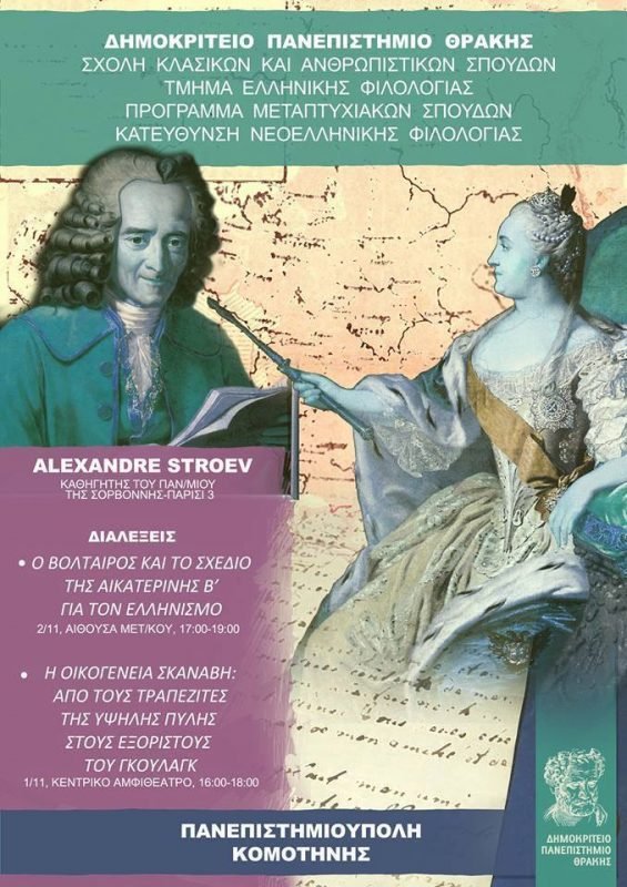 Ο Βολταίρος και το σχέδιο της Αικατερίνης Β´ για τον Ελληνισμό, 2/11, αίθουσα μετ/κου, 17:00-19:00