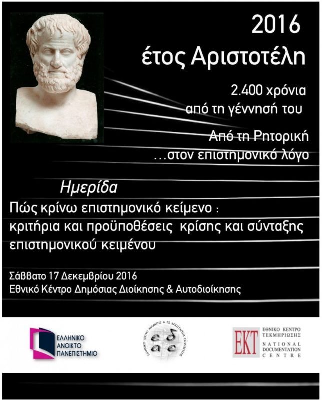 Με αφορμή το έτος 2016 πού είναι αφιερωμένο στον Αριστοτέλη, το ΕΛΛΗΝΙΚΟ ΑΝΟΙΚΤΟ ΠΑΝΕΠΙΣΤΗΜΙΟ (Συντελεστές της ΘΕ Ανοικτή και εξ Αποστάσεως Εκπαίδευση – Σχολή Ανθρωπιστικών Σπουδών), το ΕΘΝΙΚΟ ΚΕΝΤΡΟ ΤΕΚΜΗΡΙΩΣΗΣ, το ΕΛΛΗΝΙΚΟ ΔΙΚΤΥΟ ΑΝΟΙΚΤΗΣ & ΕΞ ΑΠΟΣΤΑΣΕΩΣ ΕΚΠΑΙΔΕΥΣΗΣ και το επιστημονικό περιοδικό ΑΝΟΙΚΤΗ ΕΚΠΑΙΔΕΥΣΗ, διοργανώνουν ημερίδα με τίτλο «Πώς κρίνω επιστημονικό κείμενο – κριτήρια και προϋποθέσεις ορθής σύνταξης και κρίσης επιστημονικού κειμένου».