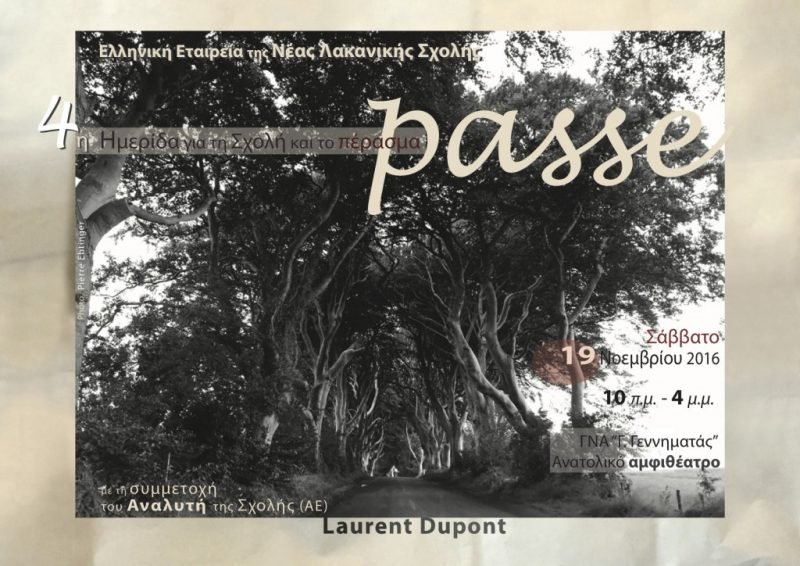 H Ελληνική Εταιρεία της Νέας Λακανικής Σχολής σας προσκαλεί στην Ψυχαναλυτική Ημερίδα για τη Σχολή και το πέρασμα (passe) η οποία θα πραγματοποιηθεί το Σάββατο 19 Νοεμβρίου 2016, 10.00 – 16.00, στο Ανατολικό αμφιθέατρο του Γ.Ν.Α. “Γ. Γεννηματάς”.