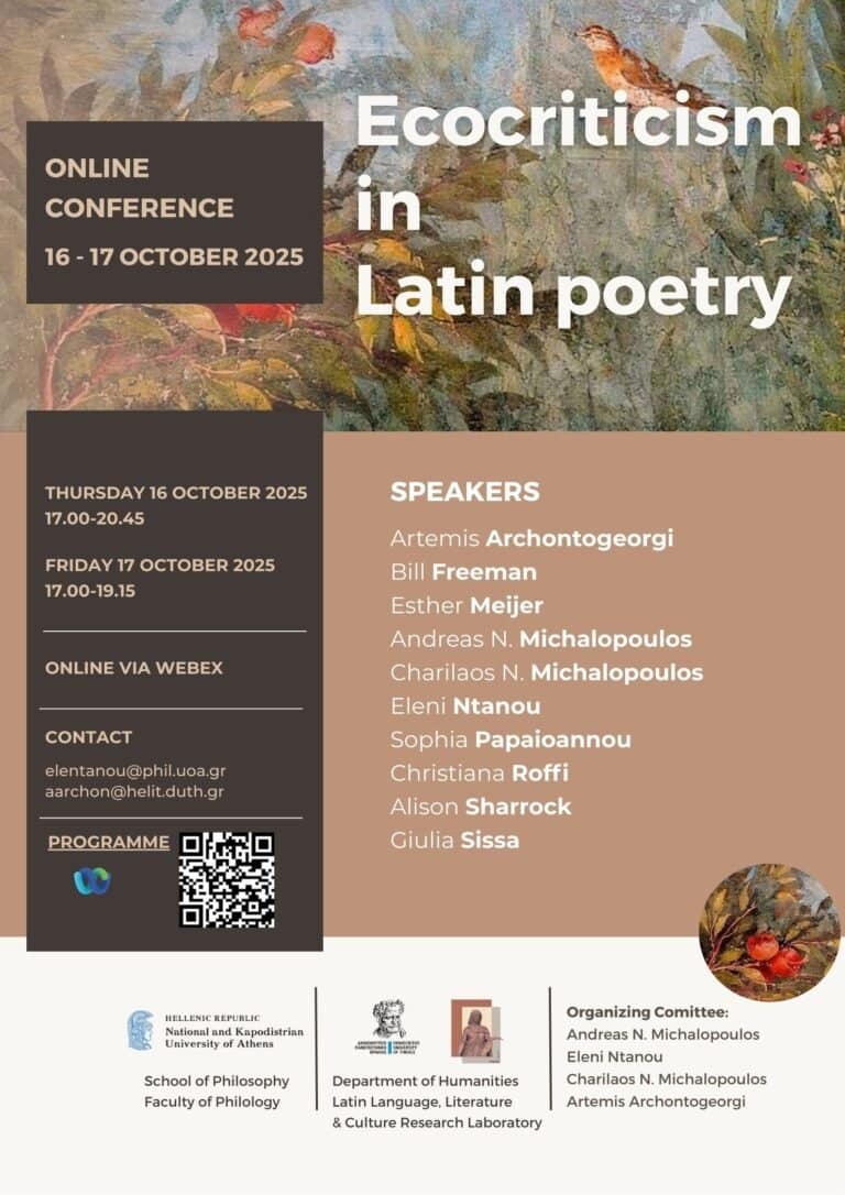 Ο Τομέας Κλασικής Φιλολογίας του Τμήματος Φιλολογίας του Εθνικού και Καποδιστριακού Πανεπιστημίου Αθηνών (Ε.Κ.Π.Α.) σε συνεργασία με το «Εργαστήριο Μελέτης Λατινικής Γλώσσας, Γραμματείας & Πολιτισμού (ΣΤΕΛΑ)» του Τμήματος Ανθρωπιστικών Σπουδών του Δημοκριτείου Πανεπιστημίου Θράκης (Δ.Π.Θ.), σας προσκαλούν στο Διεθνές Συνέδριο, με τίτλο «Οικοκριτική στη Λατινική Ποίηση» (Ecocriticism in Latin Poetry), που θα διεξαχθεί διαδικτυακά στις 16 και 17 Οκτωβρίου 2025.