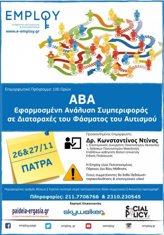Ο τομέας Δια Βίου Εκπαίδευσης και το ΚΔΒΜ της Employ, ως πιστοποιημένο Κέντρο Δια Βίου Μάθησης και αδειοδοτημένος πάροχος Δια Βίου Μάθησης από τον Εθνικό Οργανισμό Πιστοποίησης Προσόντων & Επαγγελματικού Προσανατολισμού (Ε.Ο.Π.Π.Ε.Π.) του Υπουργείου Παιδείας (Α.Π.7459/2014), υλοποιεί το επιμορφωτικό πρόγραμμα “Εφαρμοσμένη Ανάλυση Συμπεριφοράς (ΑΒΑ) σε Διαταραχές του Φάσματος του Αυτισμού” προκειμένου να ενημερώσει και να καταρτίσει τους συμμετέχοντες στο συγκεκριμένο θεματικό πεδίο της Ειδικής Αγωγής & Εκπαίδευσης.