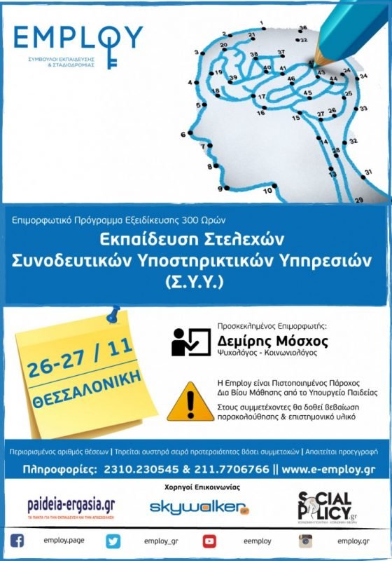 Ο τομέας Δια Βίου Εκπαίδευσης και το ΚΔΒΜ της Employ, ως πιστοποιημένο Κέντρο Δια Βίου Μάθησης και αδειοδοτημένος πάροχος Δια Βίου Μάθησης από τον Εθνικό Οργανισμό Πιστοποίησης Προσόντων & Επαγγελματικού Προσανατολισμού (Ε.Ο.Π.Π.Ε.Π.) του Υπουργείου Παιδείας (Α.Π.7459/2014), υλοποιεί το επιμορφωτικό πρόγραμμα “Εκπαίδευση Στελεχών Συνοδευτικών Υποστηρικτικών Υπηρεσιών (Σ.Υ.Υ.)” προκειμένου να ενημερώσει και να καταρτίσει τους συμμετέχοντες στο θεματικό πεδίο της Συμβουλευτικής. Η στοχοθεσία του προγράμματος διαρθρώνεται στο πνεύμα της φιλοσοφίας της δια βίου μάθησης και της ανάγκης απόκτησης ωφέλιμων γνώσεων και περισσότερων αξιοποιήσιμων προσόντων στο σχετικό πεδίο καθώς και πρακτικής αξιοποίησης των πρακτικών γνώσεων στα ΣΔΕ, ΚΔΒΜ καθώς και σε κάθε άλλη εκπαιδευτική μονάδα όπου παρέχονται Συνοδευτικές Υποστηρικτικές Υπηρεσίες.
