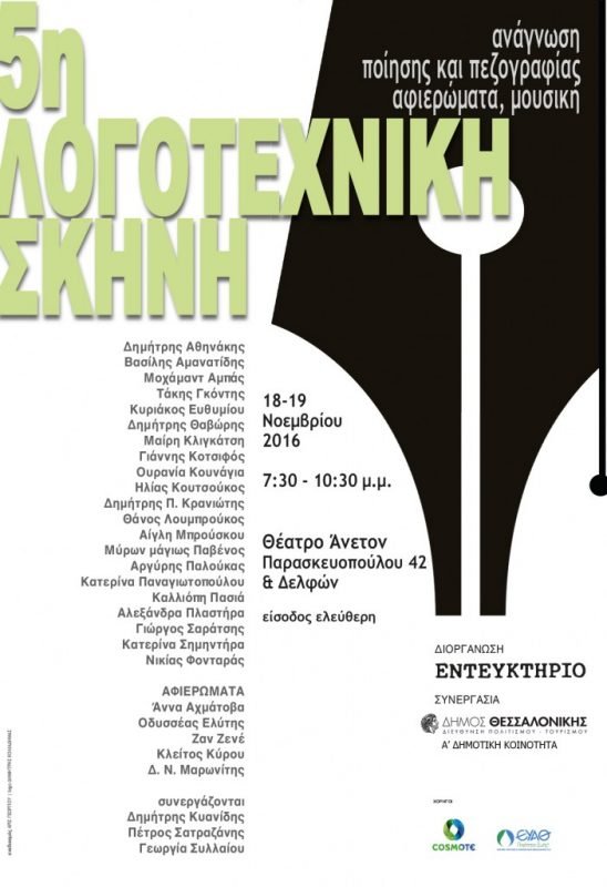 Η 5η Λογοτεχνική Σκηνή που διοργανώνει το περιοδικό «Εντευκτήριο» και ο Δήμος Θεσσαλονίκης σε συνεργασία με την 1η Δημοτική Κοινότητα, θα πραγματοποιηθεί στις 18 και 19 Νοεμβρίου 2016, κατά τις ώρες, 19.30 έως 22.30, στο Δημοτικό Θέατρο «Άνετον», (Παρασκευοπούλου 42 και Δελφών), με ελεύθερη είσοδο για το κοινό.