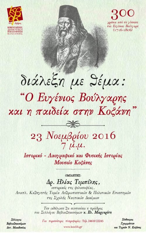 Με αφορμή τα 300 χρόνια από τη γέννηση του Ευγένιου Βούλγαρη (1716-1806), η Κοβεντάρειος Δημοτική Βιβλιοθήκη σε συνεργασία με τον Σύλλογο Βιβλιοθηκονόμων Δυτ. Μακεδονίας και τονΣύνδεσμο Γραμμάτων και Τεχνών Κοζάνης, διοργανώνει διάλεξη με θέμα: