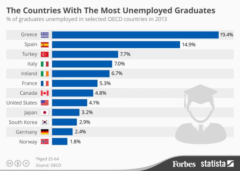 “Σε ένα περιβάλλον που χαρακτηρίζεται από υψηλή ανεργία, και κυρίως από τη συνεχόμενη ανεργία των νέων, τα ποσοστά απασχόλησης στην Ελλάδα εμφανίζουν σημαντικές διαφορές ανάλογα με το μορφωτικό επίπεδο. Στις πληθυσμιακές ομάδες με χαμηλού επιπέδου προσόντα (επίπεδα ISCED 0-2), το ποσοστό απασχόλησης ανήλθε σε 48,5 % το 2015, κοντά στον μέσο όρο της ΕΕ των 28. Στις πληθυσμιακές ομάδες με μεσαίου επιπέδου προσόντα (επίπεδα ISCED 3-4), το ποσοστό απασχόλησης ανήλθε σε 56,4 % το 2015 και ήταν πολύ χαμηλότερο από τον μέσο όρο της ΕΕ. Στις πληθυσμιακές ομάδες με υψηλού επιπέδου προσόντα (επίπεδα ISCED 5-8), το ποσοστό απασχόλησης ανήλθε σε 68,7 % το 2015 και ήταν επίσης πολύ χαμηλότερο από τον μέσο όρο της ΕΕ. Η Ελλάδα εμφανίζει άλλωστε το υψηλότερο ποσοστό (40 %) νέων ηλικίας 15-29 ετών που είναι πτυχιούχοι τριτοβάθμιας εκπαίδευσης και βρίσκονται εκτός εκπαίδευσης, απασχόλησης ή κατάρτισης.