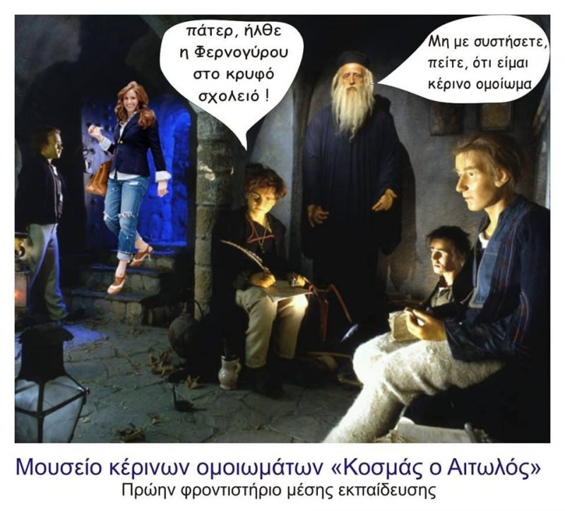 -Να σας πώ, σε εμάς μπορείτε να φοιτήσετε με ασφάλεια χωρίς ποινικές διώξεις για συνεργία σε φροντιστηριακά μαθήματα, αρκεί ο Ριρής σας να ντύνεται ένας επαναστατικός ήρωας, όπως Μαρίνος Κοντάρας, Οδυσσέας Ανδρούτσος κ.λ.π. Εσείς κυρία Φερνογύρου, στις ενημερώσεις γονέων, θα πρέπει να έρχεστε ντυμένη Λασκαρίνα Μπουμπουλίνα. Όμως τώρα προσοχή! Με ειδοποιούν, ότι έρχεται συνεργείο του ΣΔΟΕ καμουφλαρισμένο με στολές Τούρκων, Κιουταχή Μπέης, Ιμπραήμ κ.α. !!!