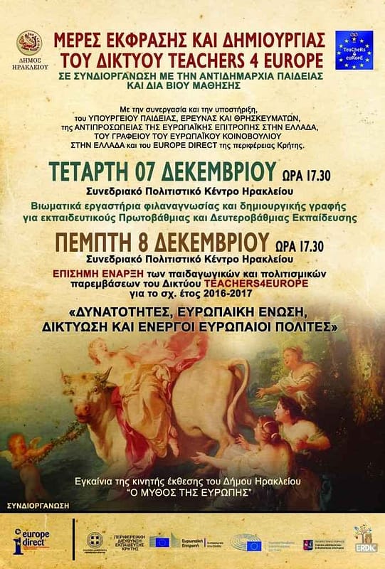 Σας επισυνάπτουμε το πρόγραμμα-πρόσκληση και την αφίσα για την έναρξη των πολιτισμικών και παιδαγωγικών παρεμβάσεων του δικτύου της ευρωπαϊκής εκπαιδευτικής δράσης Teachers4Europe στην Ανατολική Κρήτη με την διευκρίνιση ότι φέτος οι παρεμβάσεις του δικτύου είναι ανοικτές για όλα τα μέλη της εκπαιδευτικής κοινότητας, αλλά και για κάθε πολίτη που ενδιαφέρεται για θέματα με ευρωπαϊκή διάσταση.