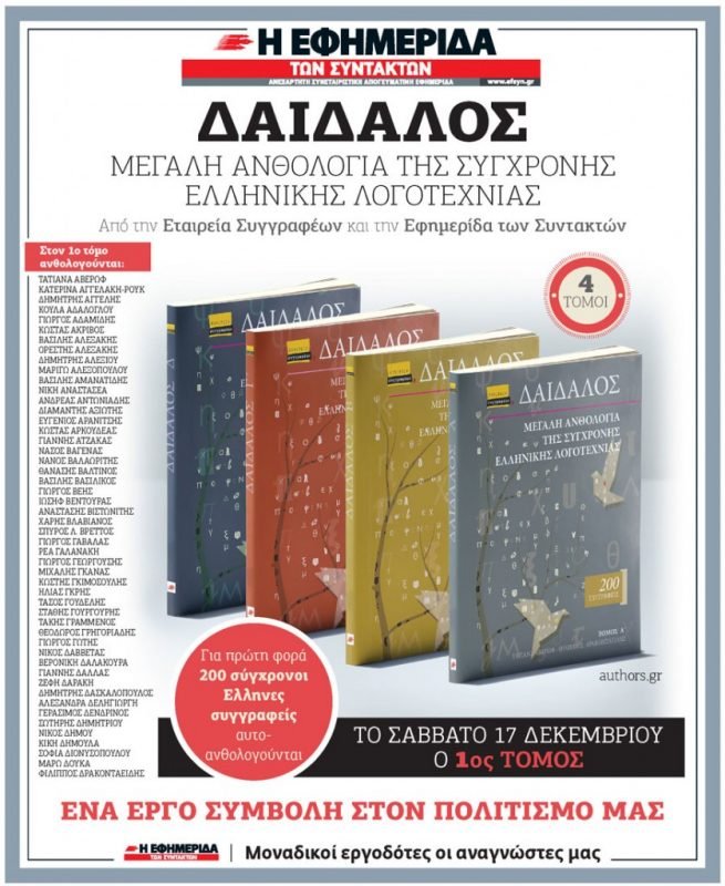 Τη Δευτέρα 19 Δεκεμβρίου και ώρα 5.30 μ.μ., η Εταιρεία Συγγραφέων και η «Εφημερίδα των Συντακτών» διοργανώνουν στο βιβλιοπωλείο IANOS παρουσίαση της Μεγάλης Ανθολογίας Σύγχρονης Λογοτεχνίας «Δαίδαλος», με κείμενα 200 πεζογράφων και ποιητών, μελών της Εταιρείας Συγγραφέων.