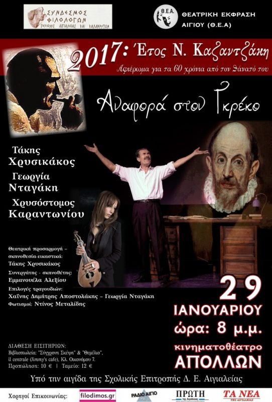 Θεατρική παράσταση:Αναφορά στον Γκρέκο Μανόλης Μαυρακάκης 9 έτη ago Θεατρική παράσταση:Αναφορά στον Γκρέκο από τον Σ.Φ. Αιγιαλείας – Καλαβρύτων.