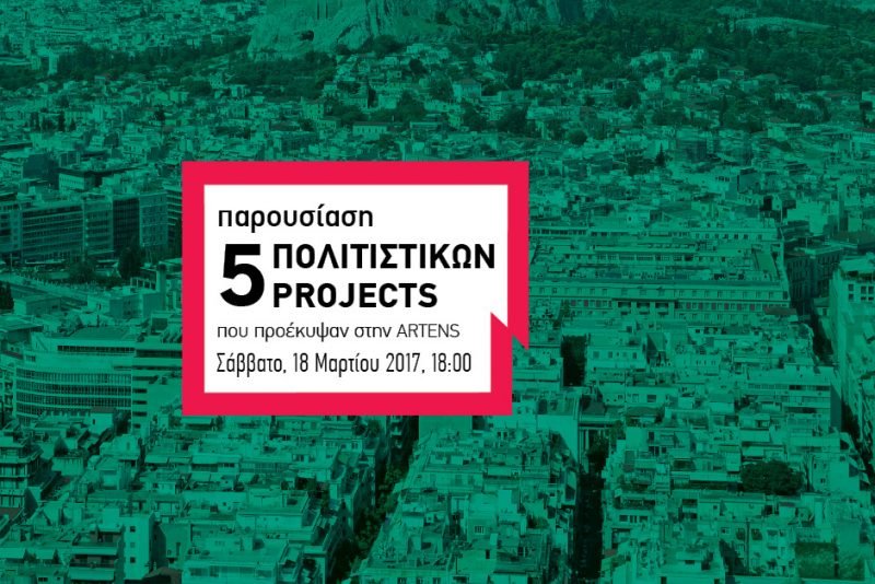 Η ARTENS, ο Νέος Χώρος Πολιτισμού στο κέντρο της Αθήνας, με ιδιαίτερη χαρά σας προσκαλεί το Σάββατο 18 Μαρτίου 2017, στις 18:00, σε μια πολυμορφική παρουσίαση των 5 Πολιτιστικών projects που προέκυψαν από το σεμινάριο Πολιτιστικής Διαχείρισης της Μυρσίνης Ζορμπά.