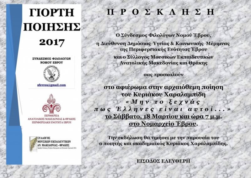 Ο Σύνδεσμος Φιλολόγων Νομού Έβρου, η Διεύθυνση Δημόσιας Υγείας & Κοινωνικής Μέριμνας της Περιφερειακής Ενότητας Έβρου και ο Σύλλογος Μουσικών Εκπαιδευτικών Ανατολικής Μακεδονίας και Θράκης σας προσκαλούν στο αφιέρωμα στην αρχαιόθεμη ποίηση του Κυριάκου Χαραλαμπίδη
