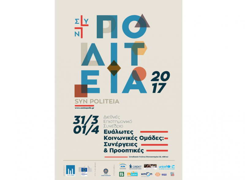 O επιστημονικός φορέας Ξένιος Πόλις σε συνεργασία με την Αντιπροσωπεία της Ευρωπαϊκής Επιτροπής στην Ελλάδα διοργανώνουν συνέδριο με θέμα «ΣΥΝ-ΠΟΛΙΤΕΙΑ 2017. Ευάλωτες Κοινωνικές Ομάδες : Συνέργειες και Προοπτικές» την Παρασκευή 31 Μαρτίου και το Σάββατο 1 Απριλίου 2017, στο Ξενοδοχείο ΤΙΤΑΝΙΑ(Πανεπιστημίου 52, Αθήνα).