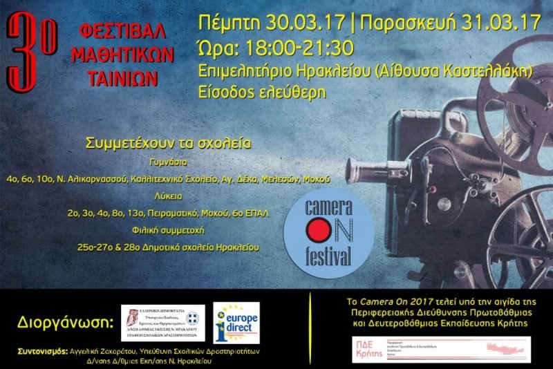Σε αυτό το πλαίσιο, το Γραφείο Σχολικών Δραστηριοτήτων της Δ/νσης Δ/θμιας Εκπ/σης Ν. Ηρακλείου και το Europe Direct–Kέντρο Ευρωπαϊκής Πληροφόρησης Περιφέρειας Κρήτης, υπό την αιγίδα της Περιφερειακής Διεύθυνσης Πρωτοβάθμιας και Δευτεροβάθμιας Εκπαίδευσης Κρήτης, διοργανώνουν το 3ο Φεστιβάλ Μαθητικών Ταινιών με τίτλο: Camera On 2017, την Πέμπτη 30 & την Παρασκευή 31 Μαρτίου 2017 και ώρα 18:00-21:30, στο Επιμελητήριο Ηρακλείου (Αίθουσα Καστελλάκη), με ελεύθερη είσοδο. Τον συντονισμό του Camera On 2017 έχει η Αγγελική Ζαχαράτου, Υπεύθυνη Σχολικών Δραστηριοτήτων Δ/θμιας Εκπ/σης Ν. Ηρακλείου.