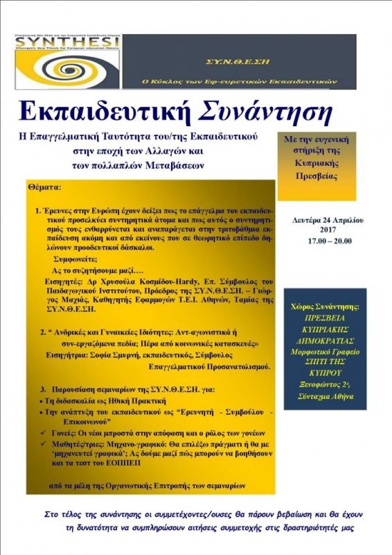 “Εξαιτίας της επιτυχημένης διοργάνωσης στις 8 Μαρτίου 2017, και κατόπιν προτάσεων μελών/συνεργατών που δεν μπόρεσαν να παραβρεθούν, η ΣΥ.N.Θ.Ε.ΣΗ. επαναλαμβάνει την “εσπερίδα” – Εκπαιδευτική Συνάντηση: “Η εκπαιδευτική ταυτότητα του εκπαιδευτικού στην εποχή των αλλαγών και των πολλαπλών μεταβάσεων” στο ίδιο μέρος, Μορφωτικό Γραφείο της Κύπρου, στις 24 Απριλίου 2017.