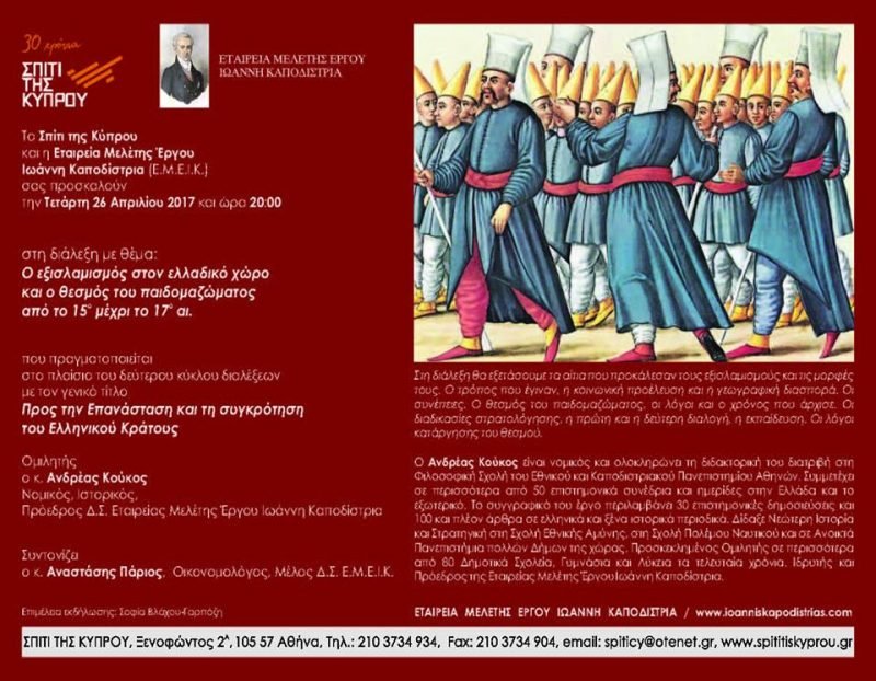 Τὸ Σπίτι τῆς Κύπρου καὶ ἡ Ἑταιρεία Μελέτης Ἔργου Ἰωάννη Καποδίστρια ἔχουν τὴν τιμὴ νὰ σᾶς προσκαλέσουν τὴν Τετάρτη 26 Ἀπριλίου 2017 – ὥρα 20.00 στὴν διάλεξη τοῦ κ. Ἀνδρέα Κούκου, Νομικοῦ, Ἱστορικοῦ, Προέδρου Ἑταιρείας Μελέτης Ἔργου Ἰωάννη Καποδίστρια μὲ θέμα: