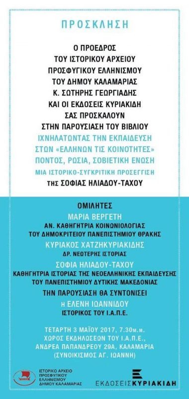 Σας προσκαλούμε στην παρουσίαση του βιβλίου “Ιχνηλατώντας την εκπαίδευση στων Ελλήνων τις κοινότητες. Πόντος, Ρωσία, Σοβιετική Ένωση. Μια ιστορικο-συγκριτική προσέγγιση” της Σοφίας Ηλιάδου-Τάχου. Τετάρτη 3 Μαϊου, 7.30 μ.μ. στο Ιστορικό Αρχείο Προσφυγικού Ελληνισμού