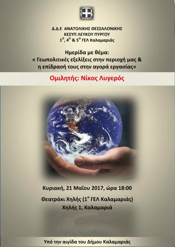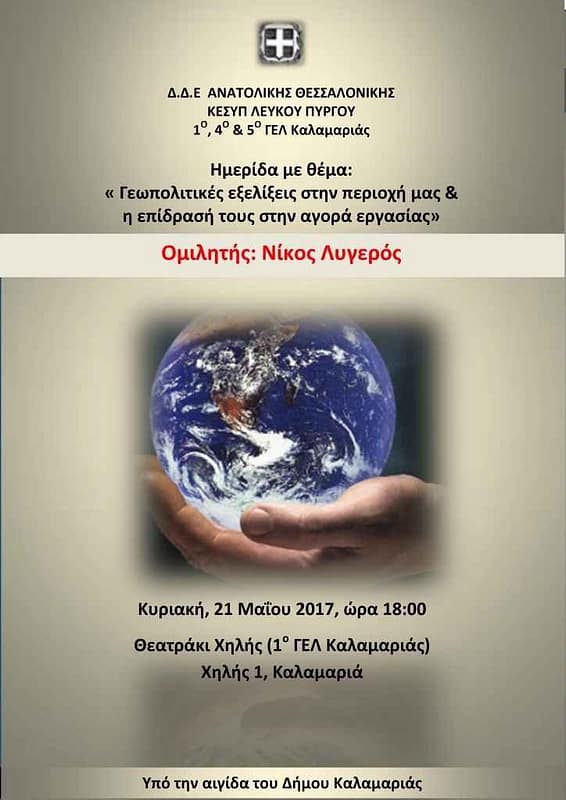 Ημερίδα θα πραγματοποιηθεί στις 21 Μαίου 2017 και ώρα 6 το απόγευμα στο Θεατράκη της Χηλής, με ομιλητή τον κ. ΝΙΚΟ ΛΥΓΕΡΟ, στην οδό Χηλής 1, Καλαμαριά, στον χώρο του 1ου ΓΕΛ Καλαμαριάς.