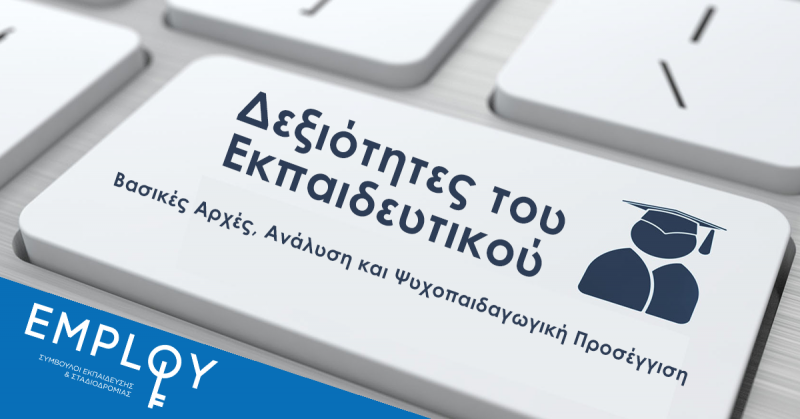 Ο τομέας Δια Βίου Εκπαίδευσης και το ΚΔΒΜ της Employ, ως πιστοποιημένο Κέντρο Δια Βίου Μάθησης και αδειοδοτημένος πάροχος Δια Βίου Μάθησης από τον Εθνικό Οργανισμό Πιστοποίησης Προσόντων & Επαγγελματικού Προσανατολισμού (Ε.Ο.Π.Π.Ε.Π.) του Υπουργείου Παιδείας (Α.Π.7459/2014), υλοποιεί το επιστημονικό σεμινάριο “Δεξιότητες του Εκπαιδευτικού: Βασικές Αρχές, Ανάλυση και Ψυχοπαιδαγωγική Προσέγγιση” προκειμένου να ενημερώσει και να καταρτίσει τους συμμετέχοντες στο θεματικό πεδίο της Εκπαίδευσης και της Διδακτικής.