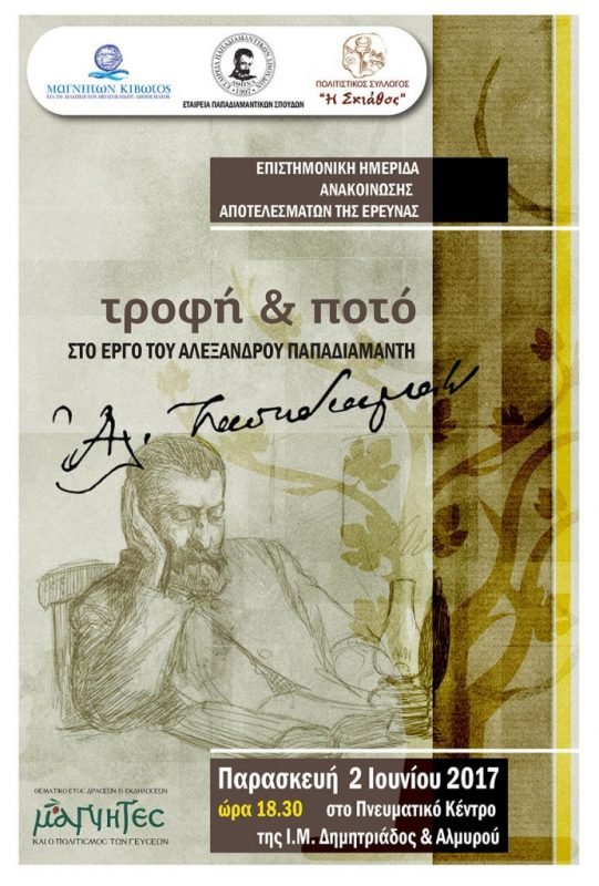 Την Παρασκευή 2 Ιουνίου 2017 και ώρα 18.30, θα πραγματοποιηθεί Επιστημονική Ημερίδα Ανακοίνωσης Αποτελεσμάτων της Έρευνας με θέμα: Τροφή & Ποτό στο Έργο του Αλέξανδρου Παπαδιαμάντη. Η Ημερίδα διοργανώνεται από τον Φορέα Πολιτισμού “Μαγνητών Κιβωτός”, την Εταιρεία Παπαδιαμαντικών Σπουδών και τον Πολιτιστικό Σύλλογο “Η Σκιάθος”, και θα διεξαχθεί στο Πνευματικό Κέντρο της Ι.Μ. Δημητριάδος & Αλμυρού.