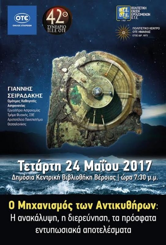 Μια πολύ ενδιαφέρουσα ομιλία για τον Μηχανισμό των Αντικυθήρων θα πραγματοποιηθεί από τον διακεκριμένο καθηγητή Αστροφυσικής του ΑΠΘ Ιωάννη Σειραδάκη την Τετάρτη 24 Μαΐου, στις 7.30μμ, στη Δημόσια Κεντρική Βιβλιοθήκη Βέροιας. Η ομιλία γίνεται στο πλαίσιο των παράλληλων εκδηλώσεων του 42ου Πανελλήνιου Συνεδρίου της Πολιτιστικής Ένωσης Εργαζομένων ΟΤΕ, που θα πραγματοποιηθεί αυτή την εβδομάδα στη Βέροια.