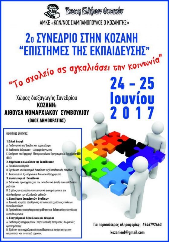Η Ένωση Ελλήνων Φυσικών σε συνεργασία με την ΑΜΚΕ «Κων/νος Σιαμπανόπουλος, ο Κοζανίτης» πραγματοποιεί το 2ο Συνέδριο στην Κοζάνη με θέμα «Επιστήμες της Εκπαίδευσης». Oι μεγάλες αλλαγές μας βρίσκουν πρωταγωνιστές στη διαμόρφωση του πλαισίου, το οποίο θα είναι αυτό που η κοινωνία απαιτεί με σύνθημα ένα Σχολείο που θα τους αγκαλιάσει όλους. Στο Συνέδριο θα συζητήσουμε και θα επικαιροποιήσουμε τις προτάσεις μας για τις θεσμικές αλλαγές που χρειάζεται να γίνουν άμεσα στο σχολικό περιβάλλον, για μια ισορροπία και επικοινωνία των μελών της Εκπαιδευτικής κοινότητας.