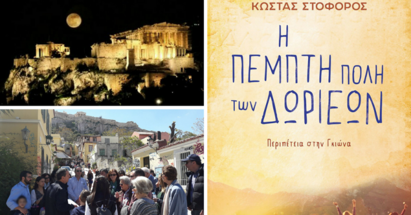 Με αφορμή το νέο μυθιστόρημα του Κώστα Στοφόρου, Η πέμπτη πόλη των Δωριέων –περιπέτεια στη Γκιώνα, και ξεκινώντας από το Μουσείο, θα περιπλανηθούμε στα στενά της Πλάκας, θα ανέβουμε στα Αναφιώτικα, θα επισκεφθούμε το σπίτι του Σεφέρη και του Παλαμά, θα γνωρίσουμε την πόλη και την ιστορία της, απολαμβάνοντας παράλληλα την πανσέληνο.