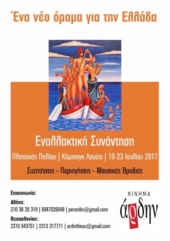 Σας προσκαλούμε 19 έως 23 Ιουλίου 2017 στην εναλλακτική συνάντηση του Άρδην στον Πλατανιά Πηλίου με συζητήσεις, εργαστήρια, περιηγήσεις, μουσικές βραδιές κ.ά.