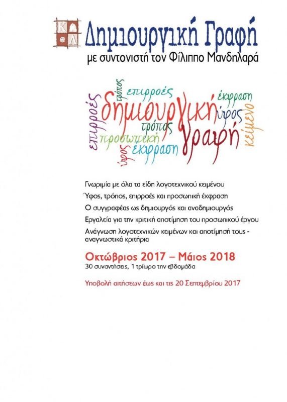 Για έκτη συνεχή χρονιά, το Ίδρυμα Αικατερίνης Λασκαρίδη διοργανώνει απογευματινό τμήμα ενηλίκων αφιερωμένο στη Δημιουργική Γραφή και προσκαλεί παλιούς και νέους φίλους στον ανανεωμένο κύκλο συναντήσεων που προγραμματίζεται για το 2017-2018.