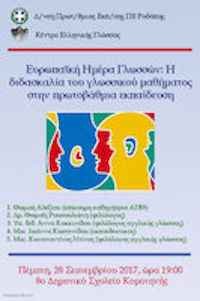 Το Κέντρο Ελληνικής Γλώσσας (ΚΕΓ) σε συνεργασία με τη Διεύθυνση Πρωτοβάθμιας Εκπαίδευσης Περιφερειακής Ενότητας Ροδόπης, στο πλαίσιο της ανάληψης από τη Διεύθυνση του Ευρωπαϊκού προγράμματος «Bringing Europe Home at School», διοργανώνουν επιμορφωτική ημερίδα με θέμα «Ευρωπαϊκή Ημέρα Γλωσσών: Η διδασκαλία του γλωσσικού μαθήματος στην πρωτοβάθμια εκπαίδευση». Η ημερίδα θα πραγματοποιηθεί την Πέμπτη, 28 Σεπτεμβρίου 2017, ώρα 19:00, στην Αίθουσα Εκδηλώσεων του 8ου Δημοτικού Σχολείου Κομοτηνής (Τέρμα Ολύμπου – Περιοχή Στρατώνων).