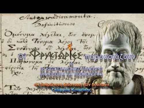 Ομιλία: «Η ΑΝΘΡΩΠΙΝΗ ΔΙΑΣΤΑΣΗ ΤΩΝ ΔΟΥΛΩΝ». Ομιλητής: ΓΕΩΡΓΙΟΣ ΚΟΥΜΑΚΗΣ, Επ. Καθηγητής Φιλοσοφίας, Τμήμα Φιλοσοφίας-Παιδαγωγικής-Ψυχολογίας του Πανεπιστημίου Ιωαννίνων. Το συνέδριο έλαβε χώρα στις 18-19-20 Οκτωβρίου 2017, στο κεντρικό κτήριο του Εθνικού και Καποδιστριακού Πανεπιστημίου Αθηνών. Διοργανώθηκε από την Διεθνή Επιστημονική Εταιρεία Αρχαίας Ελληνικής Φιλοσοφίας καθώς και την Ένωση Ελλήνων Φυσικών, και τέθηκε υπό την αιγίδα της Κοσμητείας της Φιλοσοφικής Σχολής του Πανεπιστημίου Αθηνών. Οι ΦΡΥΚΤΩΡΙΕΣ ήταν παρούσες ως χορηγός επικοινωνίας και οπτικοακουστικής τεκμηρίωσης του συνεδρίου.