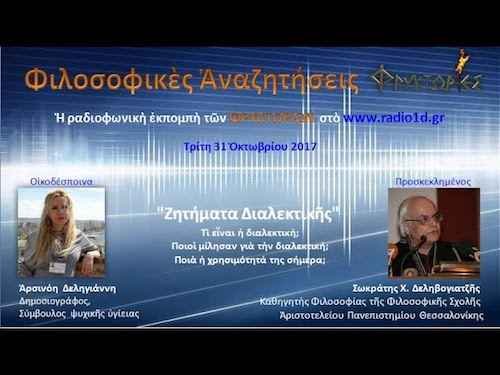 Οι ΦΡΥΚΤΩΡΙΕΣ παρουσιάζουν την συνέντευξη «ΖΗΤΗΜΑΤΑ ΔΙΑΛΕΚΤΙΚΗΣ», Τι είναι η διαλεκτική; Ποιοί μίλησαν για την διαλεκτική; Ποια η χρησιμότητά της σήμερα; Με τον κ. ΣΩΚΡΑΤΗ X. ΔΕΛΗΒΟΓΙΑΤΖΗ, καθηγητή Φιλοσοφίας της Φιλοσοφικής Σχολής του Αριστοτελείου Πανεπιστημίου Θεσσαλονίκης, η οποία παραχωρήθηκε στην ραδιοφωνική εκπομπή των Φρυκτωριών και της Αρσινόης Δεληγιάννη «Φιλοσοφικές αναζητήσεις». Η συνέντευξη μεταδόθηκε από τον ραδιοφωνικό σταθμό Θεσσαλονίκης Radio1d, στις 31 Οκτωβρίου 2017.