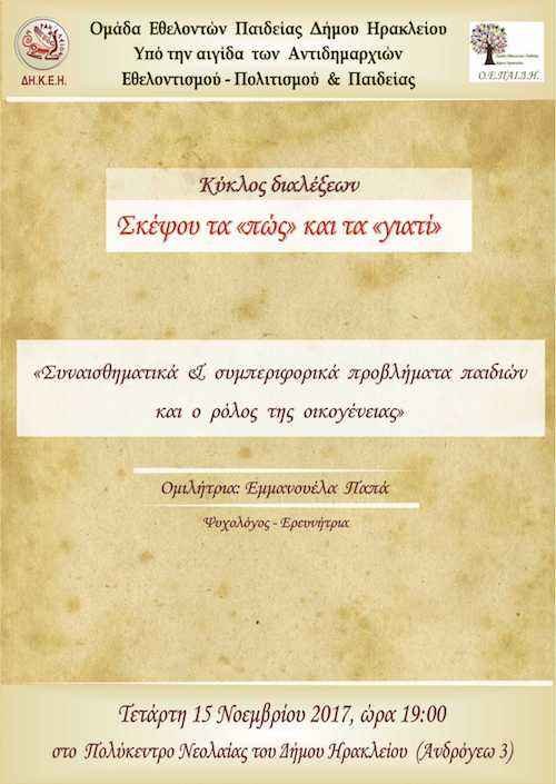 Η Ομάδα Εθελοντών Παιδείας του Δήμου Ηρακλείου υπό την αιγίδα των Αντιδημαρχιών Εθελοντισμού – Πολιτισμού και Παιδείας διοργανώνει κύκλο διαλέξεων ,με τίτλο :