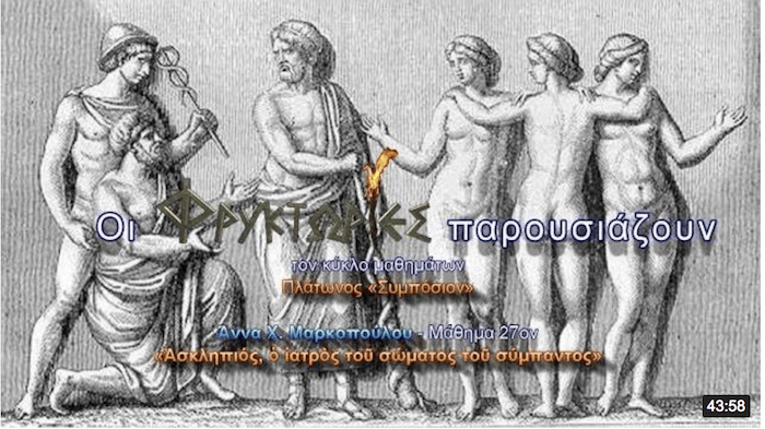 Οι ΦΡΥΚΤΩΡΙΕΣ παρουσιάζουν τον κύκλο μαθημάτων: ΠΛΑΤΩΝΟΣ “ΣΥΜΠΟΣΙΟΝ”, υπό της διδάκτορος κ. ΑΝΝΑΣ Χ. ΜΑΡΚΟΠΟΥΛΟΥ. Τίτλος 27ου μαθήματος: “ΑΣΚΛΗΠΙΟΣ, Ο ΙΑΤΡΟΣ ΤΟΥ ΣΩΜΑΤΟΣ ΤΟΥ ΣΥΜΠΑΝΤΟΣ”, το οποίο παρεδόθη στις 14 Νοεμβρίου 2017.