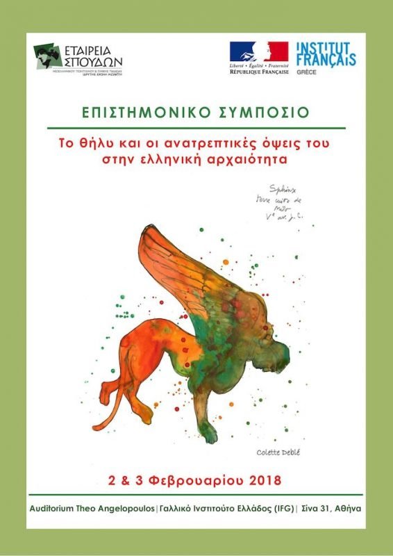 Η Εταιρεία Σπουδών Νεοελληνικού Πολιτισμού & Γενικής Παιδείας (Ιδρυτής: Σχολή Μωραΐτη) και το Γαλλικό Ινστιτούτο Ελλάδος διοργανώνουν επιστημονικό συμπόσιο με θέμα: Το θήλυ και οι ανατρεπτικές όψεις του στην ελληνική αρχαιότητα. Το συμπόσιο θα γίνει στις 2 & 3 Φεβρουαρίου 2018 στο Γαλλικό Ινστιτούτο Ελλάδος (Auditorium Theo Angelopoulos), Σίνα 31, Αθήνα.