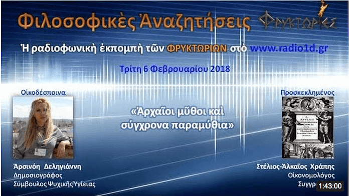Οι ΦΡΥΚΤΩΡΙΕΣ παρουσιάζουν την συνέντευξη «ΑΡΧΑΙΟΙ ΜΥΘΟΙ ΚΑΙ ΣΥΓΧΡΟΝΑ ΠΑΡΑΜΥΘΙΑ». Μία συζήτηση με τον κον ΣΤΕΛΙΟ-ΑΛΚΑΙΟ ΧΡΑΠΗΣ, οικονομολόγο και συγγραφέα. Η συνέντευξη παραχωρήθηκε στην ραδιοφωνική εκπομπή των Φρυκτωριών και της Αρσινόης Δεληγιάννη «Φιλοσοφικές αναζητήσεις». Μεταδόθηκε από τον ραδιοφωνικό σταθμό Θεσσαλονίκης Radio1d στις 6 Φεβρουαρίου 2018.