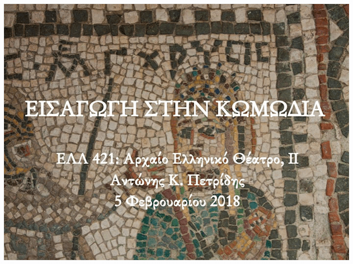 Στο βίντεο που ακολουθεί καταγράφεται τηλεσεμινάριο, που παραδόθηκε το πλαίσιο της Θεματικής Ενότητας ΕΛΛ421: Αρχαίο Ελληνικό Θέατρο ΙΙ (Κωμωδία) του Προγράμματος “Σπουδές στον Ελληνικό Πολιτισμό” του Ανοικτού Πανεπιστημίου Κύπρου στις 12 Οκτωβρίου 2018.