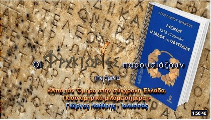 Οι ΦΡΥΚΤΩΡΙΕΣ παρουσιάζουν την ομιλία: «ΑΠΟ ΤΟΝ ΟΜΗΡΟ ΣΤΗΝ ΣΥΓΧΡΟΝΗ ΕΛΛΑΔΑ. ΠΟΣΟ ΟΜΗΡΙΚΑ ΜΙΛΑΜΕ ΣΗΜΕΡΑ;». Αναλύει και τεκμηριώνει ο κ. ΓΙΩΡΓΟΣ ΛΑΘΥΡΗΣ – ΙΑΛΥΣΣΟΣ, νομικός, φιλόλογος και συγγραφέας, ιδρυτής και διευθύνων της Πολιτιστικής – Ερευνητικής Εταιρείας ΗΛΙΟΔΡΟΜΙΟΝ. Η ομιλία είναι βασισμένη στο «ΛΕΞΙΚΟΝ ΚΑΤΑ ΣΤΟΙΧΕΙΟΝ ΙΛΙΑΔΟΣ ΚΑΙ ΟΔΥΣΣΕΙΑΣ» του ΑΠΟΛΛΩΝΙΟΥ ΣΟΦΙΣΤΟΥ (1ος αι. μ.Χ.), ένα από τα αρχαιότερα διασωθέντα Λεξικά της Γλώσσας μας. Ένα ειδικό Ερμηνευτικό και Ετυμολογικό Λεξικό των Ομηρικών Επών, 2.000 και πλέον ετών, το οποίο εκδίδεται για πρώτη φορά στην Ελλάδα. Η ομιλία δόθηκε στην Αθήνα, στην αίθουσα ΕΛΛΗΝ.Α.Ι.Σ., στις 27 Ιανουαρίου 2018.