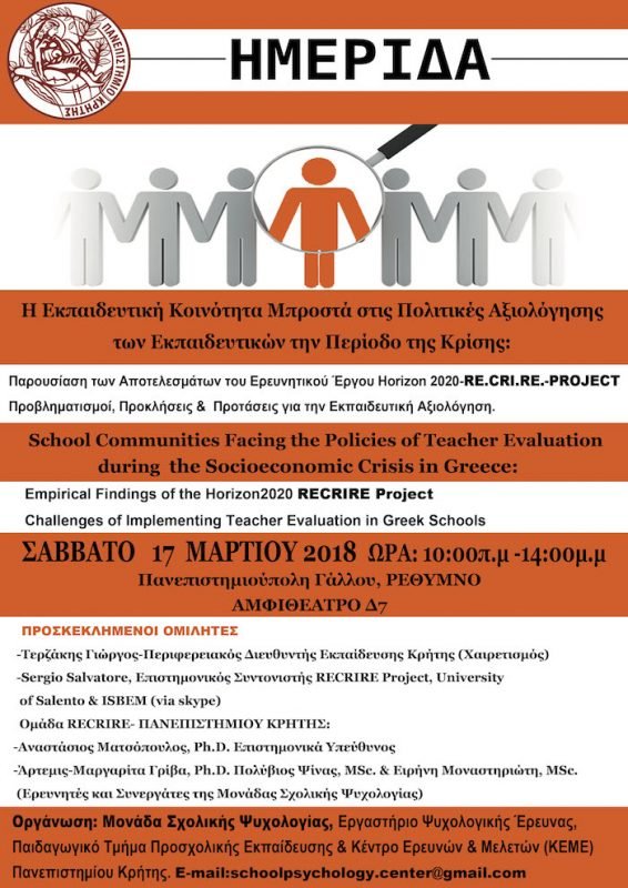 Η ημερίδα θα επικεντρωθεί στα πιο πρόσφατα ερευνητικά δεδομένα από μια εμπειρική έρευνα η οποία διεξήχθη στο πλαίσιο του προγράμματος Horizon2020 RECRIRE project που υλοποίησε η Μονάδα Σχολικής Ψυχολογίας του Πανεπιστημίου Κρήτης από το 2015 και ολοκληρώνεται τον Απρίλιο του 2018. Η έρευνα επικεντρώνεται στo πεδίο της αξιολόγησης των εκπαιδευτικών και πώς εκείνοι αντιλαμβάνονται ένα σύστημα αξιολόγησης ωφέλιμο για τους ίδιους και για την ευρύτερη εκπαιδευτική κοινότητα.