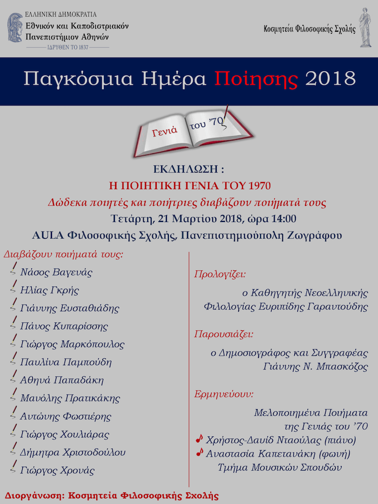 Η Κοσμητεία της Φιλοσοφικής Σχολής του Εθνικού και Καποδιστριακού Πανεπιστημίου Αθηνών εορτάζει την Παγκόσμια Ημέρα Ποίησης και διοργανώνει εκδήλωση με τίτλο: