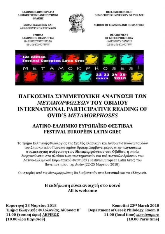 Το Τμήμα Ελληνικής Φιλολογίας της Σχολής Κλασικών και Ανθρωπιστικών Σπουδών του Δημοκριτείου Πανεπιστημίου Θράκης λαμβάνει μέρος στην παγκόσμια συμμετοχική ανάγνωση των Μεταμορφώσεων του Οβιδίου, η οποία διοργανώνεται στο πλαίσιο των επιστημονικών και πολιτιστικών δράσεων του Λατινο-Eλληνικού Ευρωπαϊκού Φεστιβάλ (Festival Européen Latin Grec) του Πανεπιστημίου της Λυών (22-25 Μαρτίου 2018).