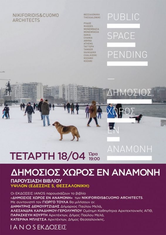 Την Τετάρτη 18 Απριλίουστις 19.00, οι εκδόσεις IANOS παρουσιάζουν το βιβλίο «Δημόσιος χώρος εν αναμονή | Publicspacepending» των Nikiforidis&CuomoArchitects στον πολυχώρο Ύψιλον (Εδέσσης 5) στη Θεσσαλονίκη.