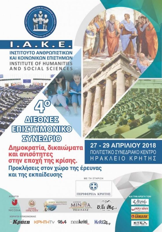 με θέμα «Δημοκρατία, δικαιώματα και ανισότητες στην εποχή της κρίσης. Προκλήσεις στον χώρο της έρευνας και της εκπαίδευσης»,το οποίο θα πραγματοποιηθεί στις 27-29 Απριλίου 2018, στο Πολιτιστικό Συνεδριακό Κέντρο Ηρακλείου, στο Ηράκλειο της Κρήτης. Στο πρόγραμμα του Συνεδρίου έχουν ενταχθεί:α) εισηγήσεις από προσκεκλημένους εισηγητές, β) εισηγήσεις, παρουσιάσεις και αναρτημένες ανακοινώσεις που έχουν κριθεί από την Επιστημονική Επιτροπή, γ) συμπόσια, και δ) εργαστήρια. Οι συμμετέχοντες εισηγητές υπερβαίνουν τους 400, οι εισηγήσεις των οποίων θα παρουσιαστούν σε παράλληλες συνεδρίες. Το Συνέδριο διεξάγεται με τη στήριξη της Περιφέρειας Κρήτης, Δήμων της περιφερειακής ενότητας Ηρακλείου και πλήθους συνεργατών από τον χώρο της Εκπαίδευσης, της Εκκλησίας, του πολιτισμού και της επιχειρηματικότητας, καθώς επίσης με την ευλογία του Οικουμενικού Πατριάρχου κ.κ. Βαρθολομαίου.