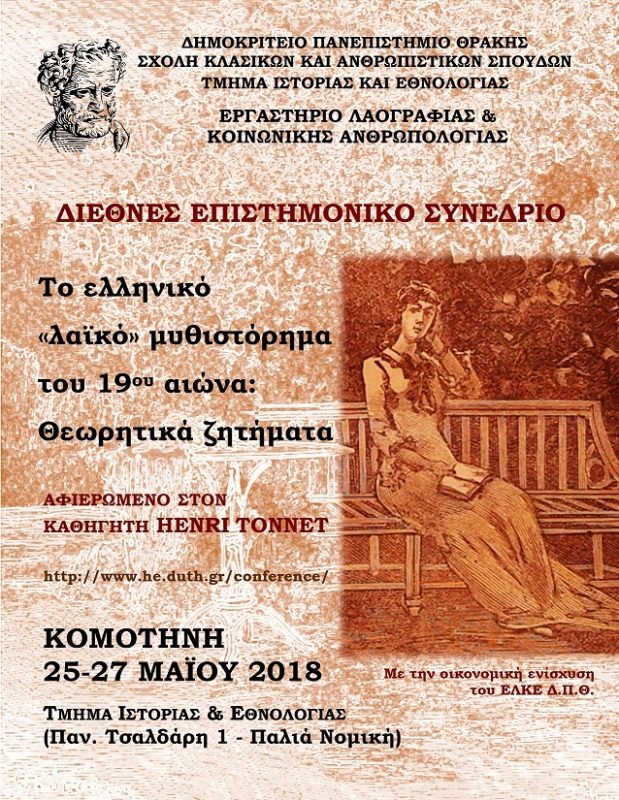 Το Εργαστήριο Λαογραφίας και Κοινωνικής Ανθρωπολογίας του Τμήματος Ιστορίας και Εθνολογίας του Δημοκρίτειου Πανεπιστημίου Θράκης οργανώνει διεθνές επιστημονικό συνέδριο με τίτλο: «Το ελληνικό “λαϊκό” μυθιστόρημα του 19ου αιώνα. Θεωρητικά Ζητήματα», το οποίο θα διεξαχθεί στην Κομοτηνή από 25 έως και 27 Μαΐου 2018, στις εγκαταστάσεις του Δημοκρίτειου Πανεπιστημίου Θράκης. Το συνέδριο είναι αφιερωμένο στον Νεοελληνιστή – Ομότιμο Καθηγητή στη Σορβόννη κ. Henri Tonnet, ο οποίος έχει συμβάλει καθοριστικά με τις εργασίες του στη μελέτη του ελληνικού «λαϊκού» μυθιστορήματος του 19ου αιώνα.