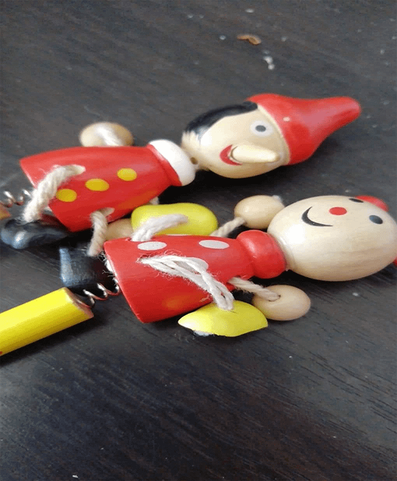 Μία μαθήτρια βρήκε μια νέα χρήση για τα μολύβια. Τα παίρνει μαζί της, όταν γράφει εξετάσεις. Τα τοποθετεί πάνω στο θρανίο της την ώρα των πανελλαδικών και τους ρίχνει κλέφτες ματιές. Δύο μολύβια. Το ένα έχει τον Πινόκιο και το άλλο ένα αρκουδάκι. Ο Πινόκιο συνδέεται με το ψέμα. Ο κόσμος που προσφέρουμε στα παιδιά συνδέεται με το ψέμα. Το αρκουδάκι πάλι συνδέεται με την παιδική αθωότητα. Είναι η αλήθεια που αντιπροτείνουν πάντα τα παιδιά. Τα δύο μολύβια αλληλεπιδρούν και συνομιλούν πάνω στο θρανίο την ώρα που η μαθήτρια γράφει εξετάσεις. Ο Πινόκιο πάντως έχει ένα εγγενές μειονέκτημα. Όταν λέει ψέματα, μεγαλώνει η μύτη του…