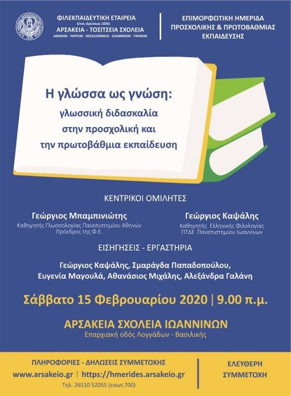 H Εποπτεία των Σχολείων της Φιλεκπαιδευτικής Εταιρείας (Αρσάκεια – Τοσίτσεια Σχολεία) διοργανώνει Ημερίδα με θέμα: «Η γλώσσα ως γνώση: γλωσσική διδασκαλία στην προσχολική και την πρωτοβάθμια εκπαίδευση». Η ημερίδα θα πραγματοποιηθεί το Σάββατο 15 Φεβρουαρίου 2020 στα Αρσάκεια Σχολεία Ιωαννίνων (επαρχιακή οδός Λογγάδων – Βασιλικής) με ελεύθερη συμμετοχή για τους εκπαιδευτικούς πρωτοβάθμιας εκπαίδευσης των δημοσίων και ιδιωτικών σχολείων και θα δοθεί βεβαίωση παρακολούθησης.