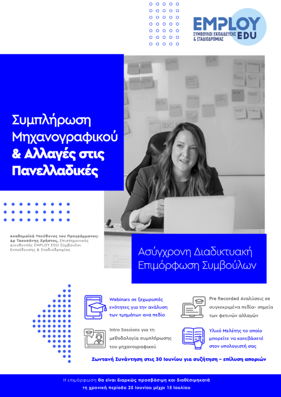 Για ακόμη μια φορά καινοτομούμε και παρέχουμε για πρώτη φορά στην Ελλάδα σε εκπαιδευτικούς, φροντιστές, συμβούλους καθώς και κάθε ενδιαφερόμενο τη δυνατότητα να συμμετέχει σε μια επιμόρφωση πάνω στη συμπλήρωση του μηχανογραφικού και τις πρόσφατες αλλαγές παρακολουθώντας στους δικούς του χρόνους και όχι απλά να στηθεί για ώρες σε μια οθόνη με χρονικούς περιορισμούς!